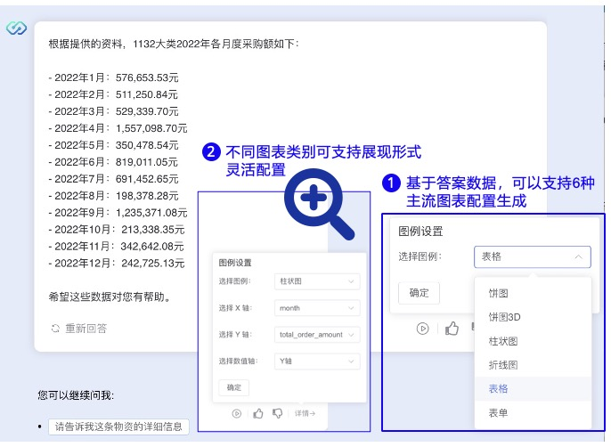 在业务问答场景中,常常面临数据支持不足的痛点,缺少灵活、直观的图表工具使得数据展示复杂且耗时。而传统的图表生成方式缺乏多样性,无法根据业务需求灵活调整图表样式,影响信息的可视化效果和数据解读的效率。智能数据分析工具通过简单的配置即可生成多种类型的图表,快速满足业务需求,减少人工操作并提高工作效率。系统支持多种主流图表类型的灵活配置,用户可以根据业务场景自由选择适合的展示形式,实现多维度的数据展示。此外,图表一键生成功能让数据展示更加直观清晰,帮助用户快速理解数据背后的业务洞察,提升整体决策效率。