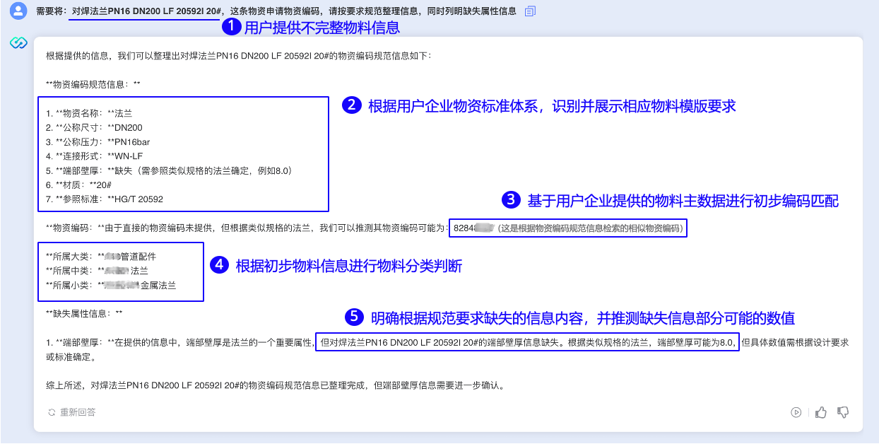 系统能够识别申请中缺失的信息,并基于已有的数据模型推测出可能的数值,帮助用户尽快完成物料信息的补全,提升工作效率。